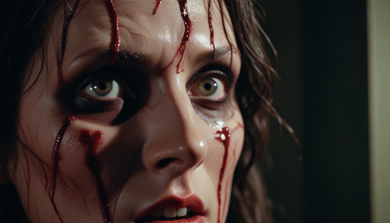 blood, close-up, dripping, expression, eyes, face, fear, film, gore, horror, injury, movie, open, red, scared, scary, scene, shocked, wide, woman