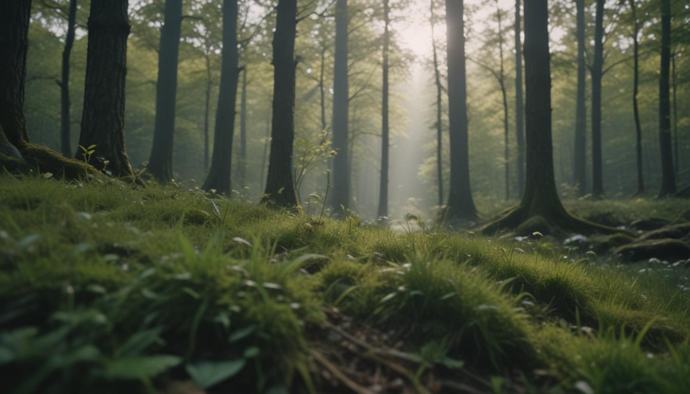 A low angle view of the forest floor, showing sunlight filtering through the tall trees. The ground is covered in green grass and leaves.
