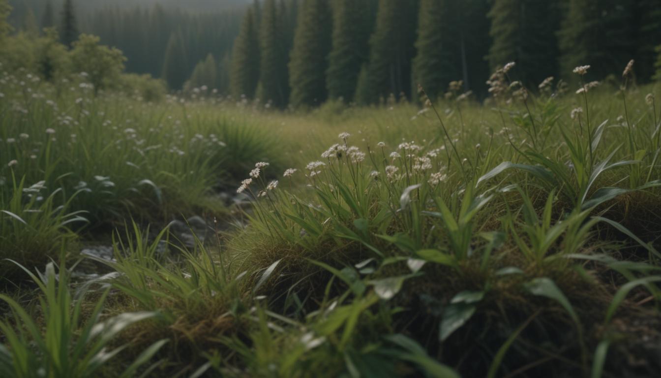 A grassy meadow with white flowers near a forest
