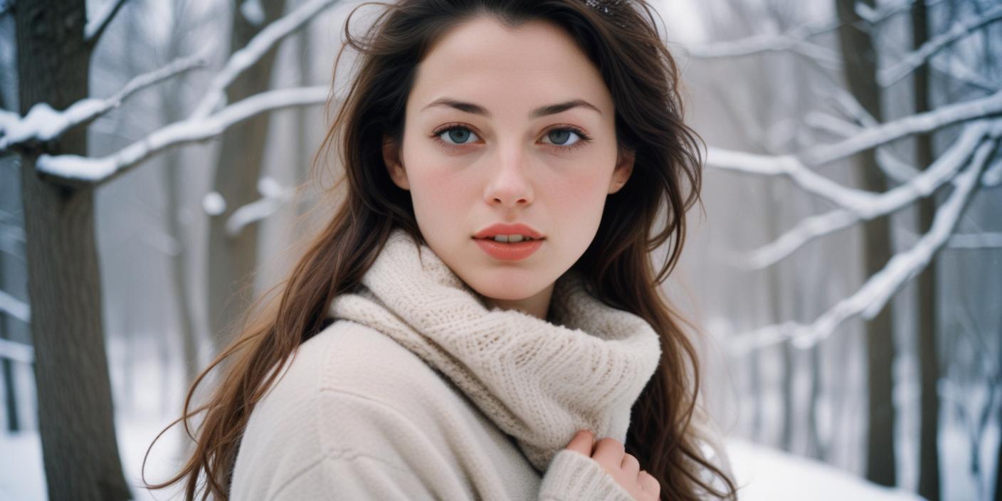 beautiful, branches, brown hair, cold, cold weather, eyes, forest, landscape, nature, outdoors, portrait, season, snow, snowy landscape, sweater, tree, white, winter, winter wonderland, woman