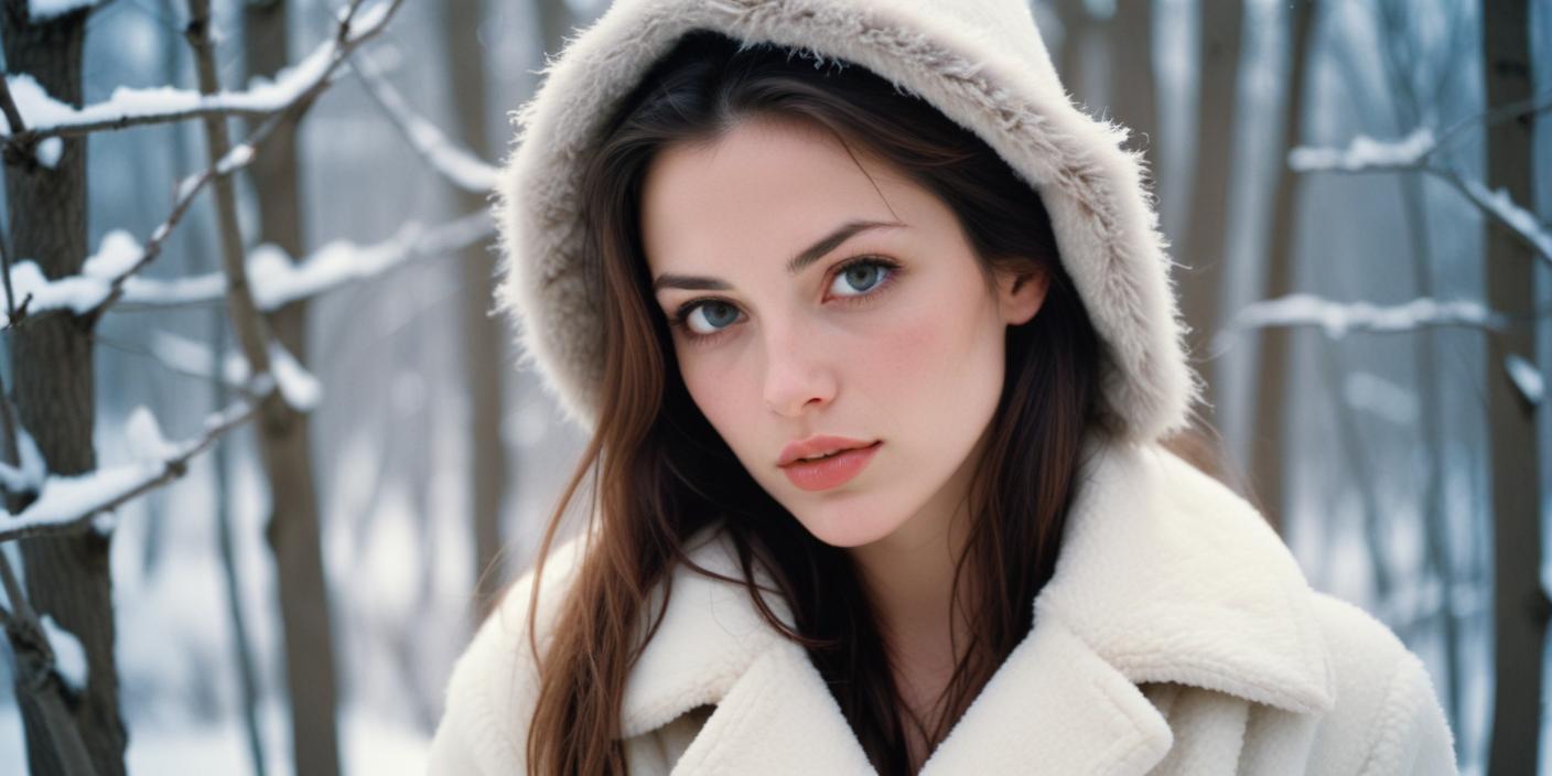 background, beauty, blurry, branches, coat, fashion, forest, fur, hood, looking, model, nature, outdoors, portrait, smiling, snow, trees, white, winter, woman