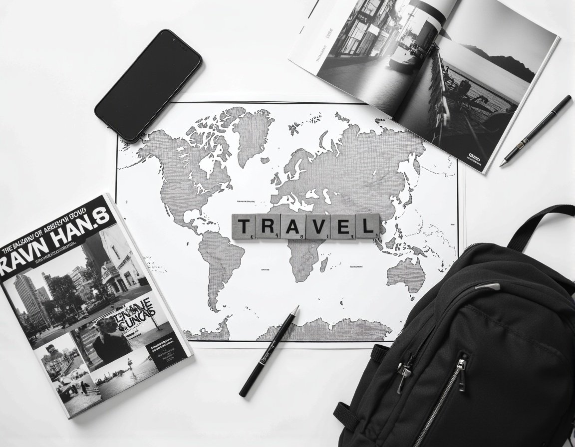 A world map with the word travel spelled out in tiles, surrounded by a backpack, a book, a phone, and a pen.