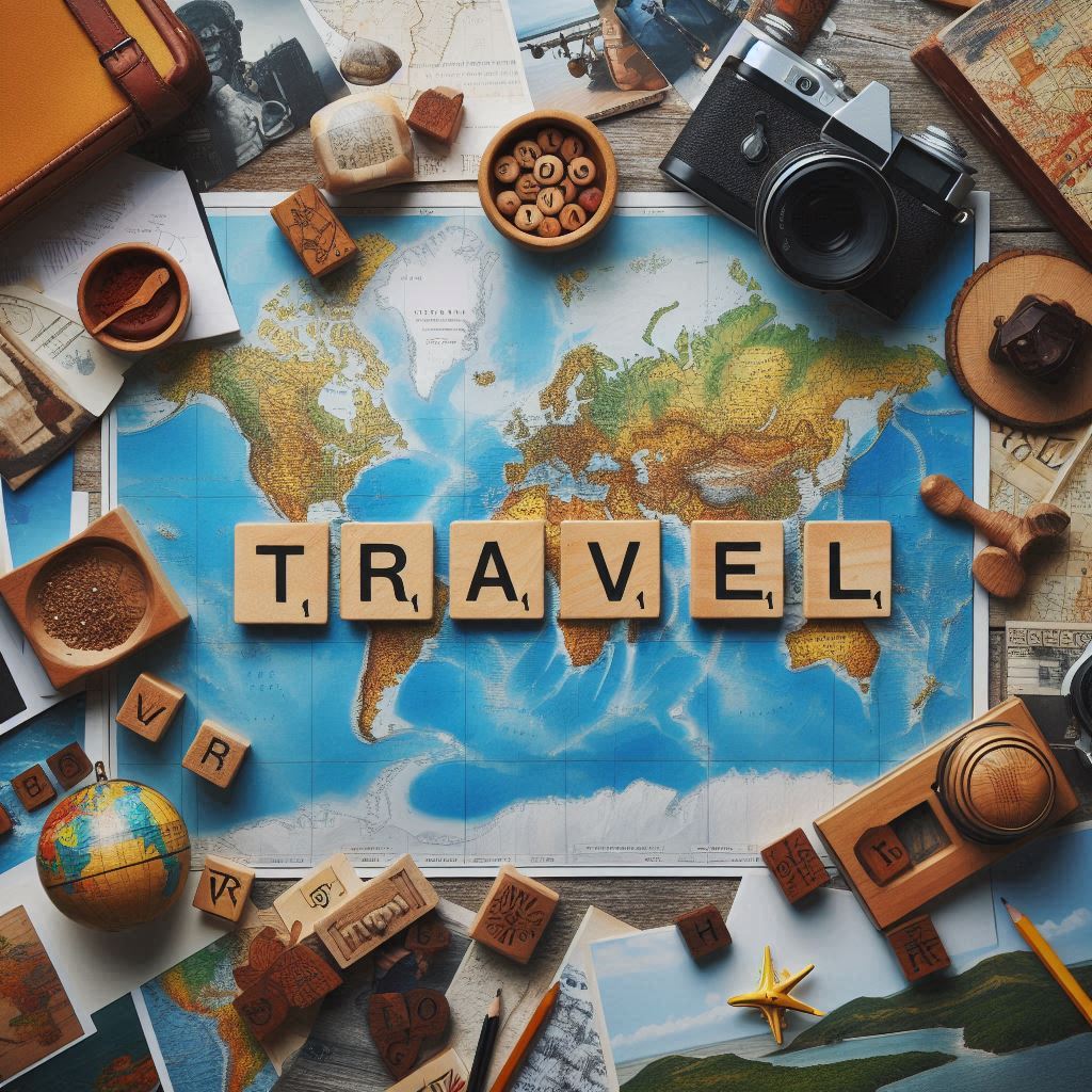 A world map surrounded by travel-themed objects, including a camera, globe, and wooden tiles spelling out the word TRAVEL.
