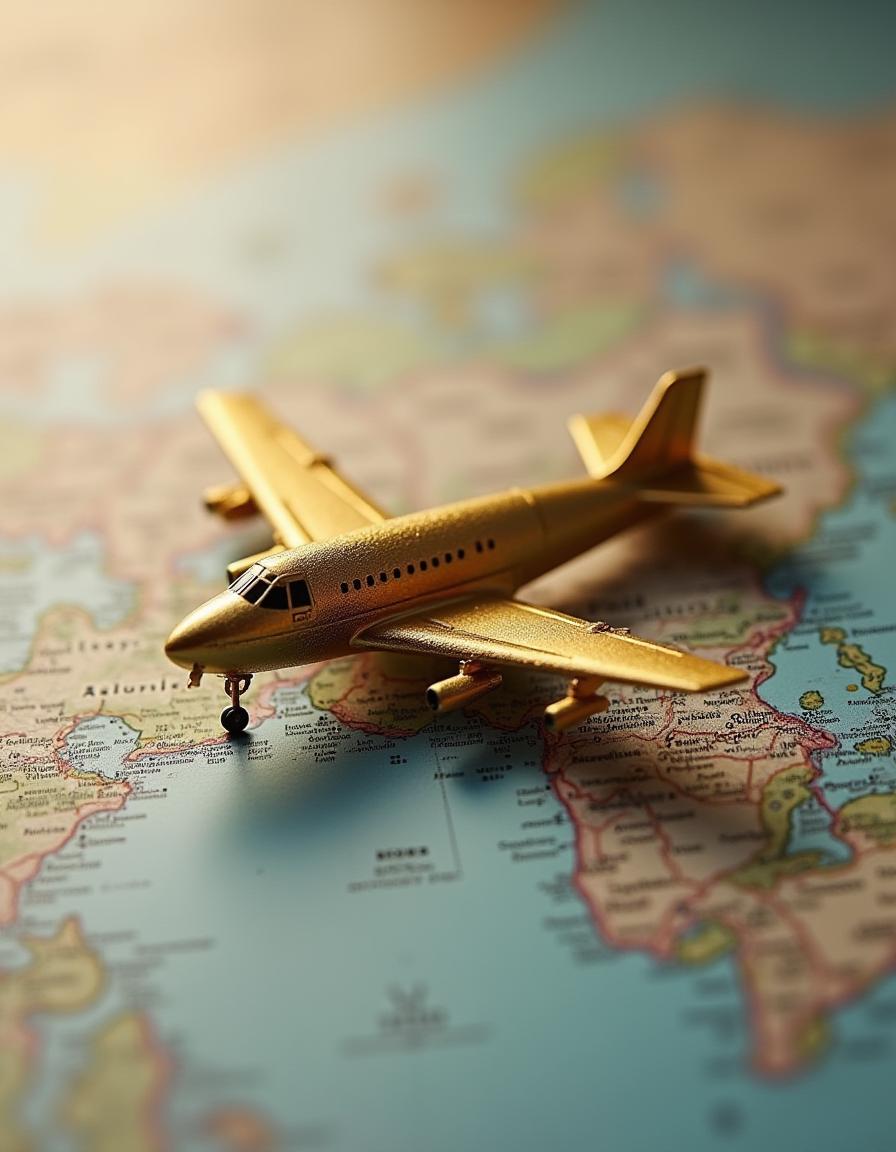 A gold model airplane sits on a world map. The airplane is in the middle of the frame, with its wings spread out.