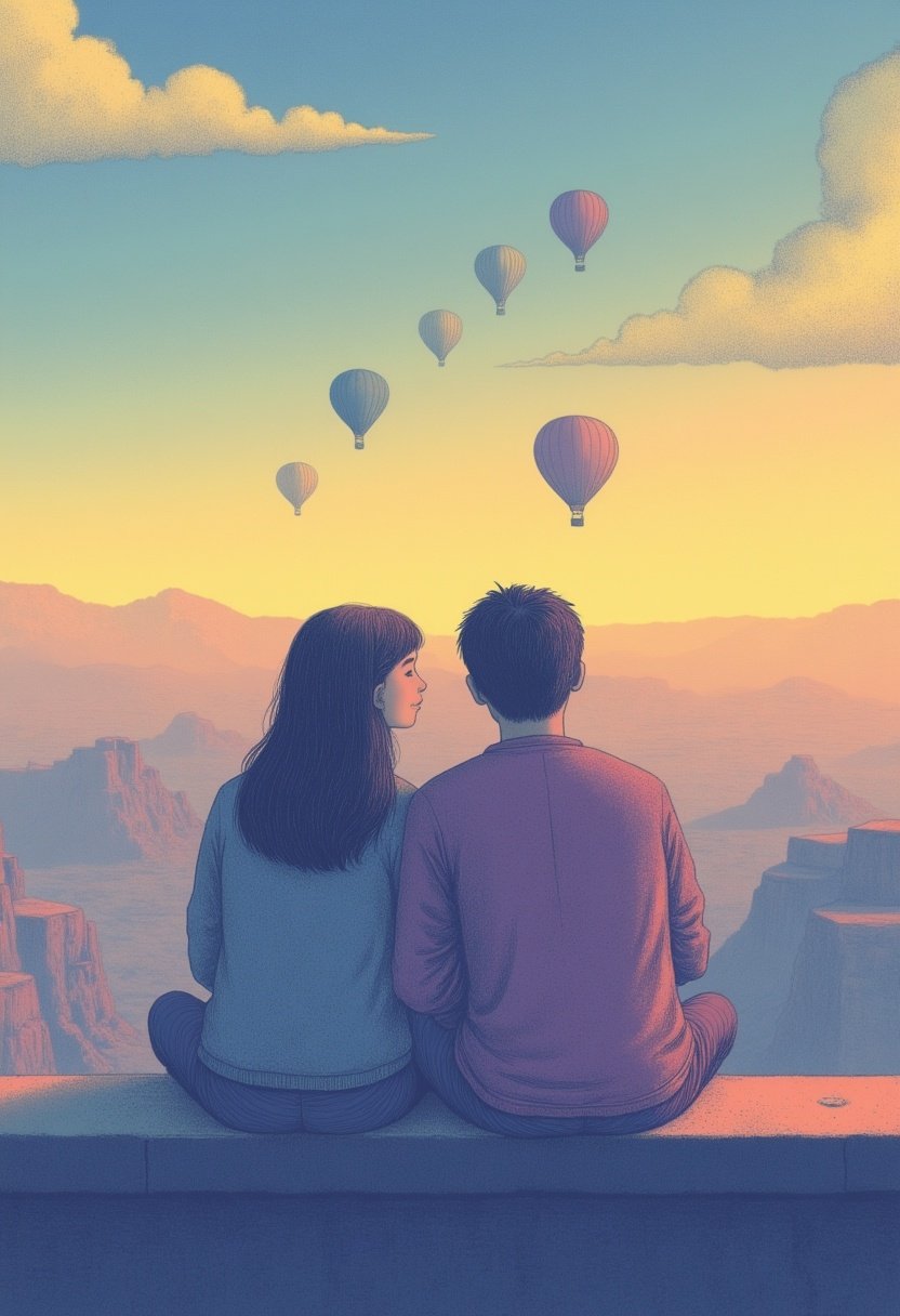 A young man and woman are sitting on a ledge looking out at a canyon landscape. The sky is filled with hot air balloons at sunset.
