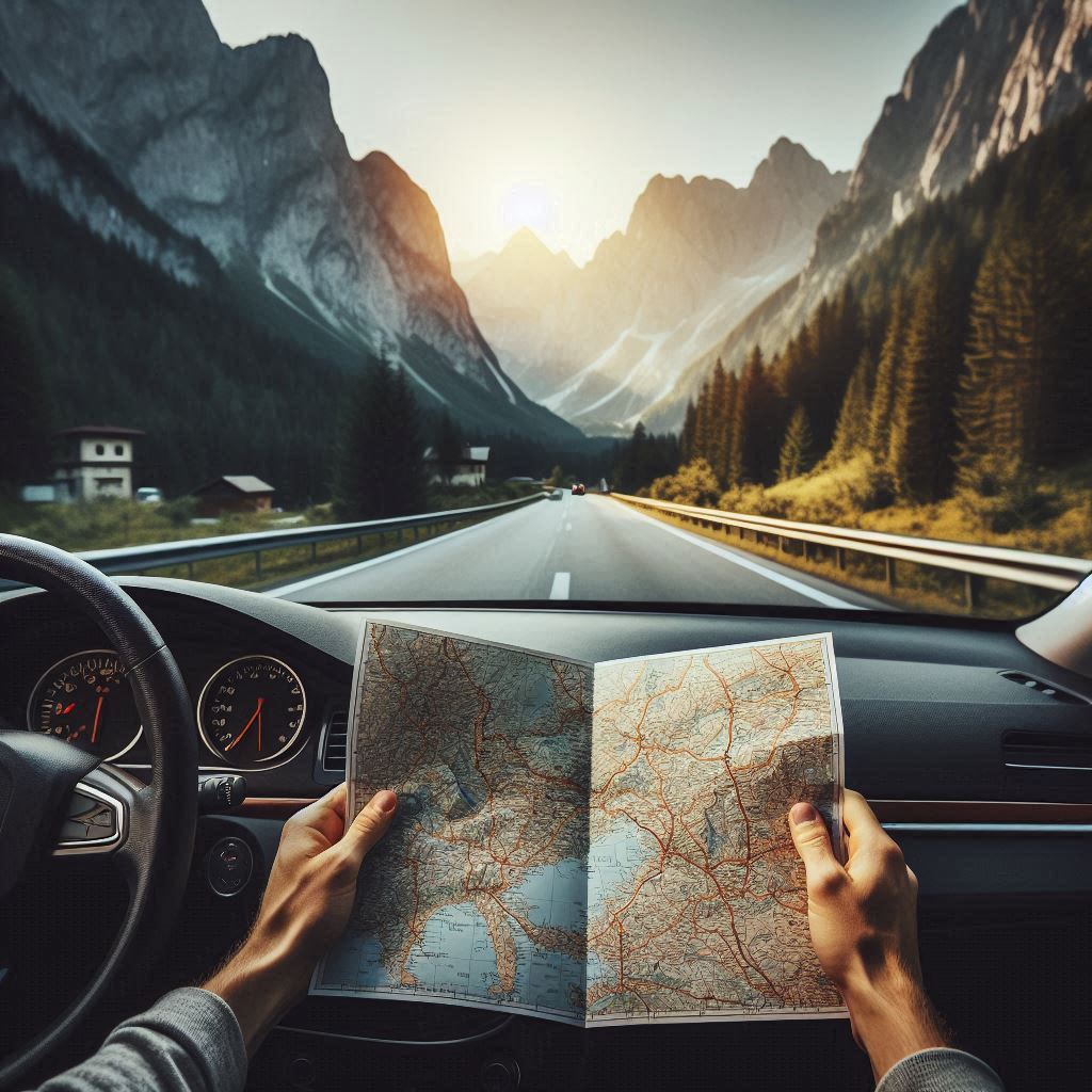 A driver navigates through the mountains with a map