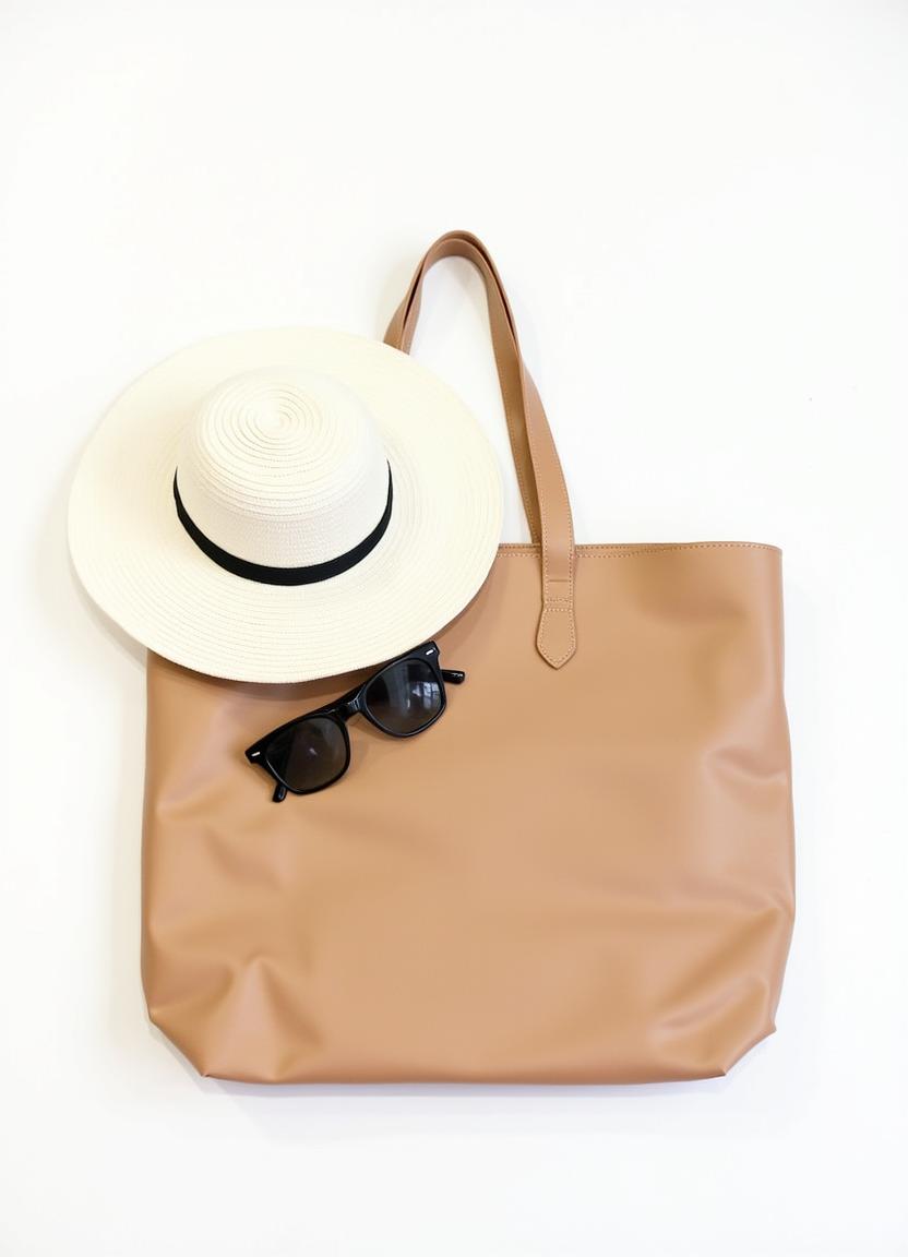 A tan leather tote bag lays flat on a white surface. A white sun hat is placed above the bag.
