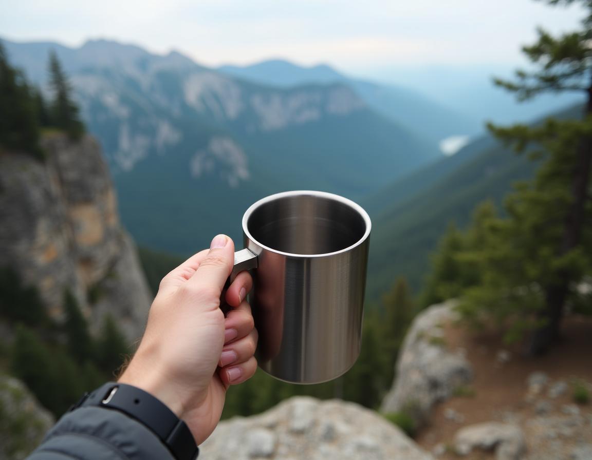 A person's hand is holding a stainless steel mug. The mug is in focus, while the background of mountains and trees is blurry.