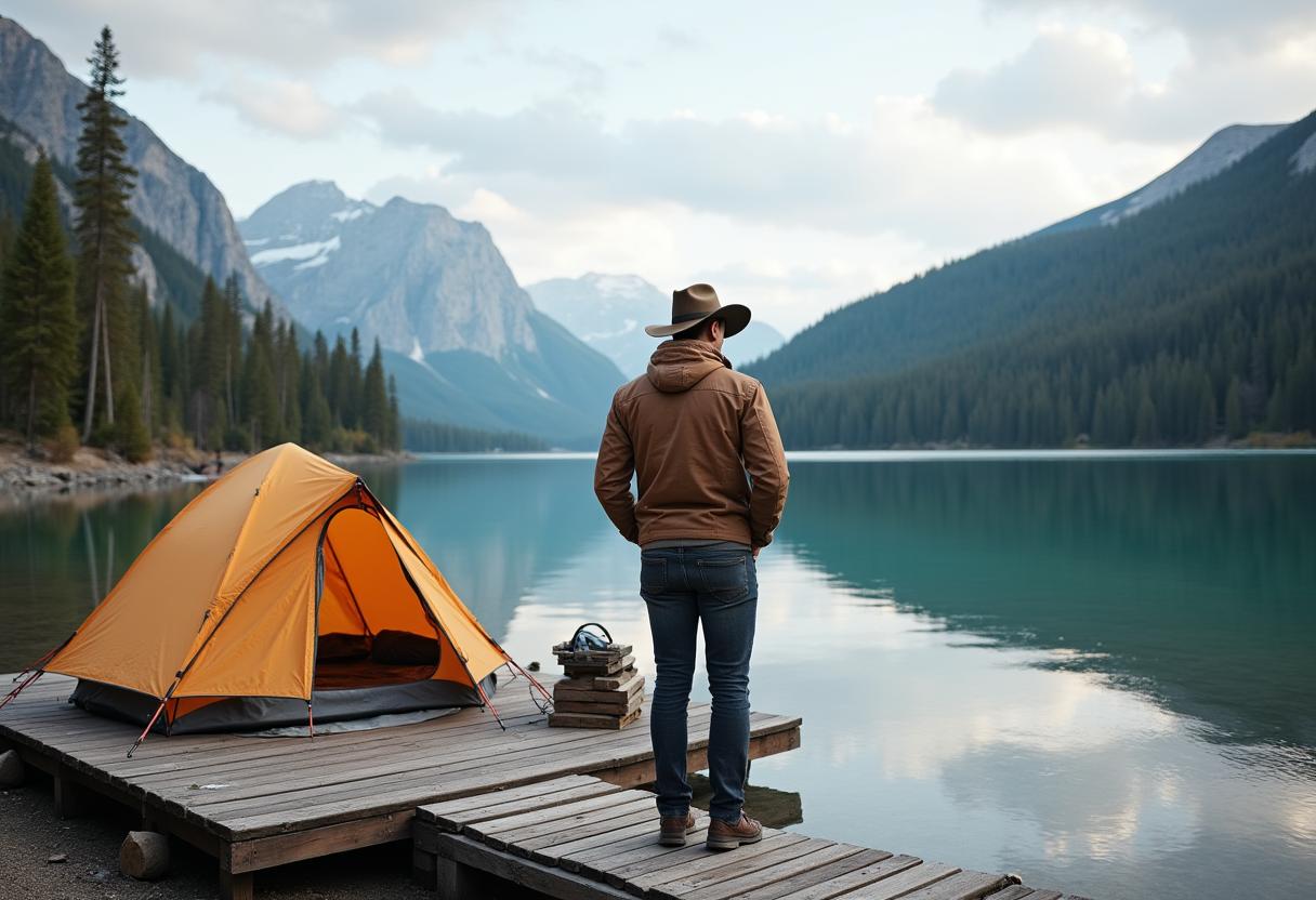 A man in a hat stands on a dock overlooking a lake