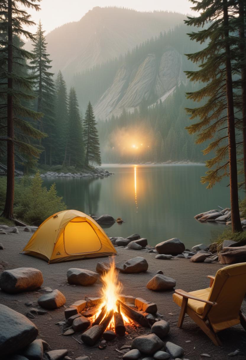 adventure, campfire, camping, campsite, chair, fire, forest, lake, mountains, nature, outdoors, relax, sky, sunset, tent, tranquil, travel, trees, water, wilderness