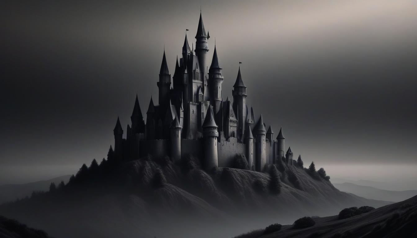 A large, dark castle sits on a hill overlooking a misty landscape.