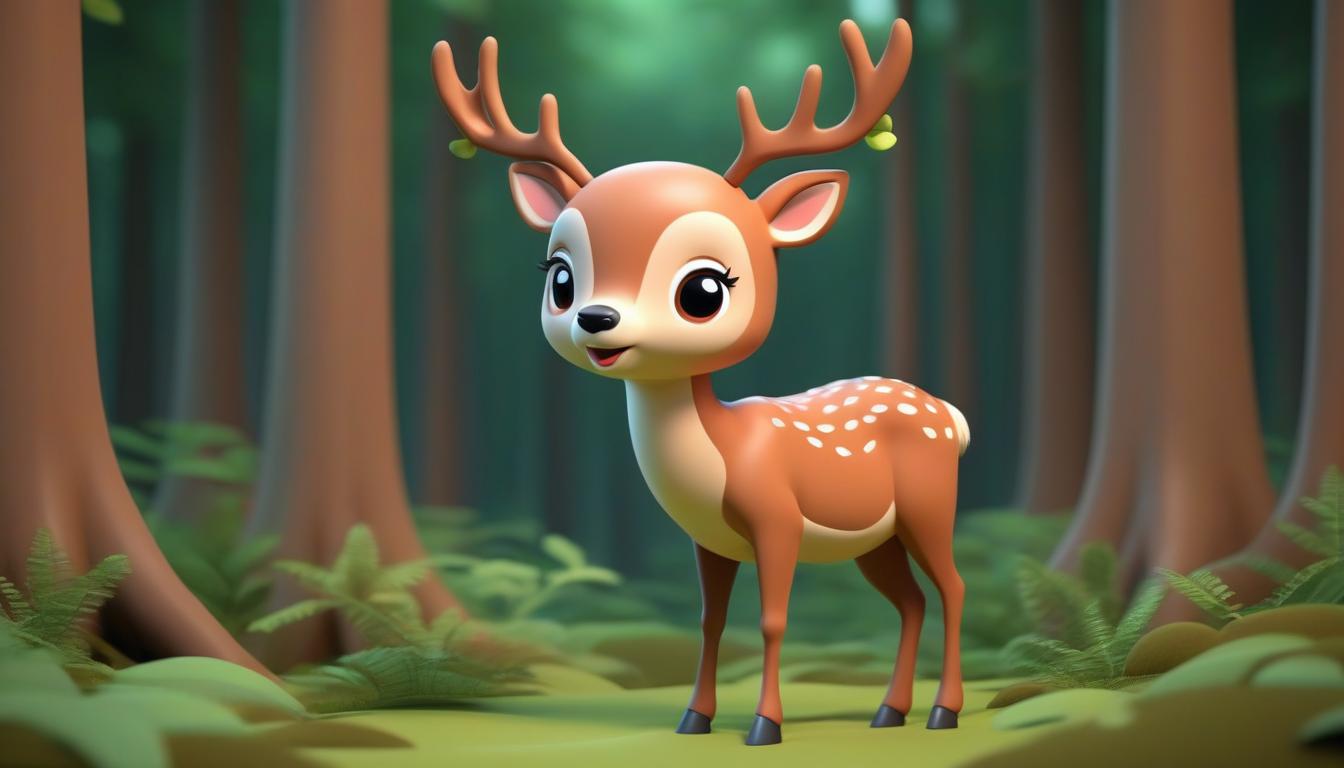 A cartoon deer with big eyes and antlers stands in a forest with brown tree trunks and green leaves.