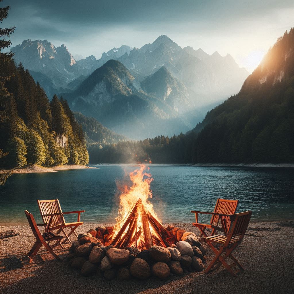 beach, bonfire, campfire, chair, fire, flame, lake, landscape, mountain, mountains, nature, outdoor, rocks, scenery, shore, sunrise, sunset, water, wood, wooden