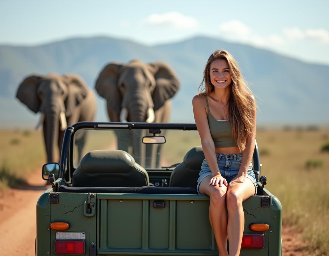 adventure, africa, animals, brown, dirt, elephant, green, happy, jeep, nature, road, safari, shorts, smiling, tank top, travel, vacation, wild, wildlife, woman