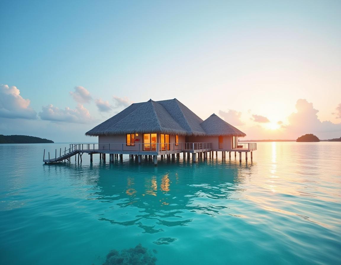 A water bungalow sits on a calm lagoon at sunset