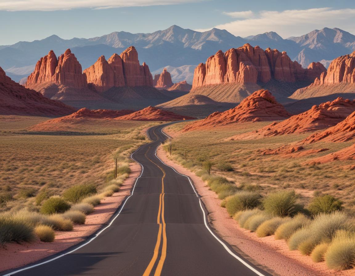 adventure, desert, horizon, landscape, mountains, nature, paved, red, road, rock formations, sandstone, scenic, scenic drive, shrubs, sky, sunrise, sunset, travel, utah, winding