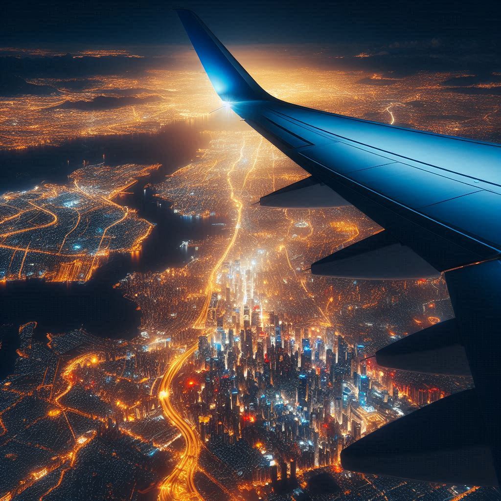 aerial, aerial view, airplane, airplane wing, city, city skyline, cityscape, cityscape lights, flight, flight view, lights, night, night cityscape, plane wing, sky, travel, urban, urban landscape, view, wing