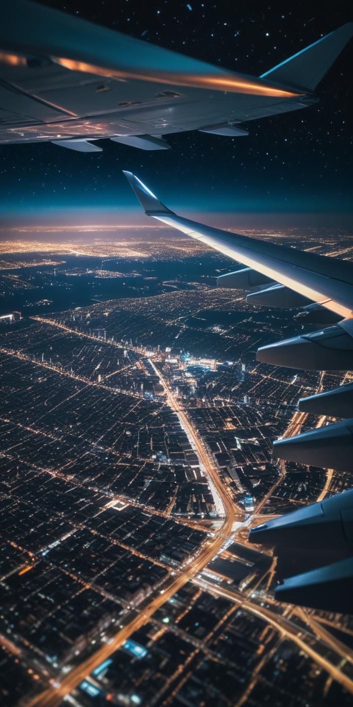 A city is illuminated by streetlights and buildings at night, as seen from a plane window. The plane's wing is visible in the foreground.