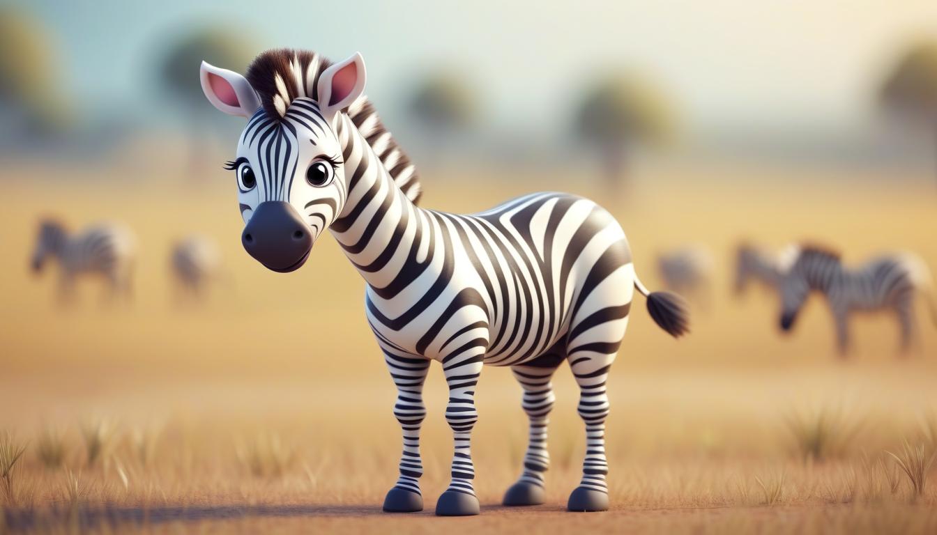 A cartoon zebra stands in a field of tall grass, looking at the camera with a friendly expression. Other zebras are visible in the background.
