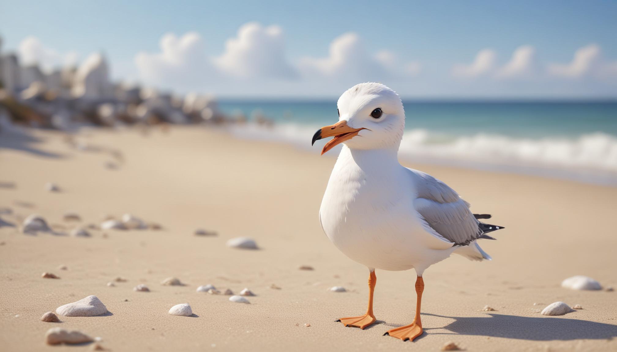 animal, beach, beak, bird, coast, coastline, feet, grey, nature, ocean, orange, sand, seagull, sky, summer, water, wave, white, wildlife, wings
