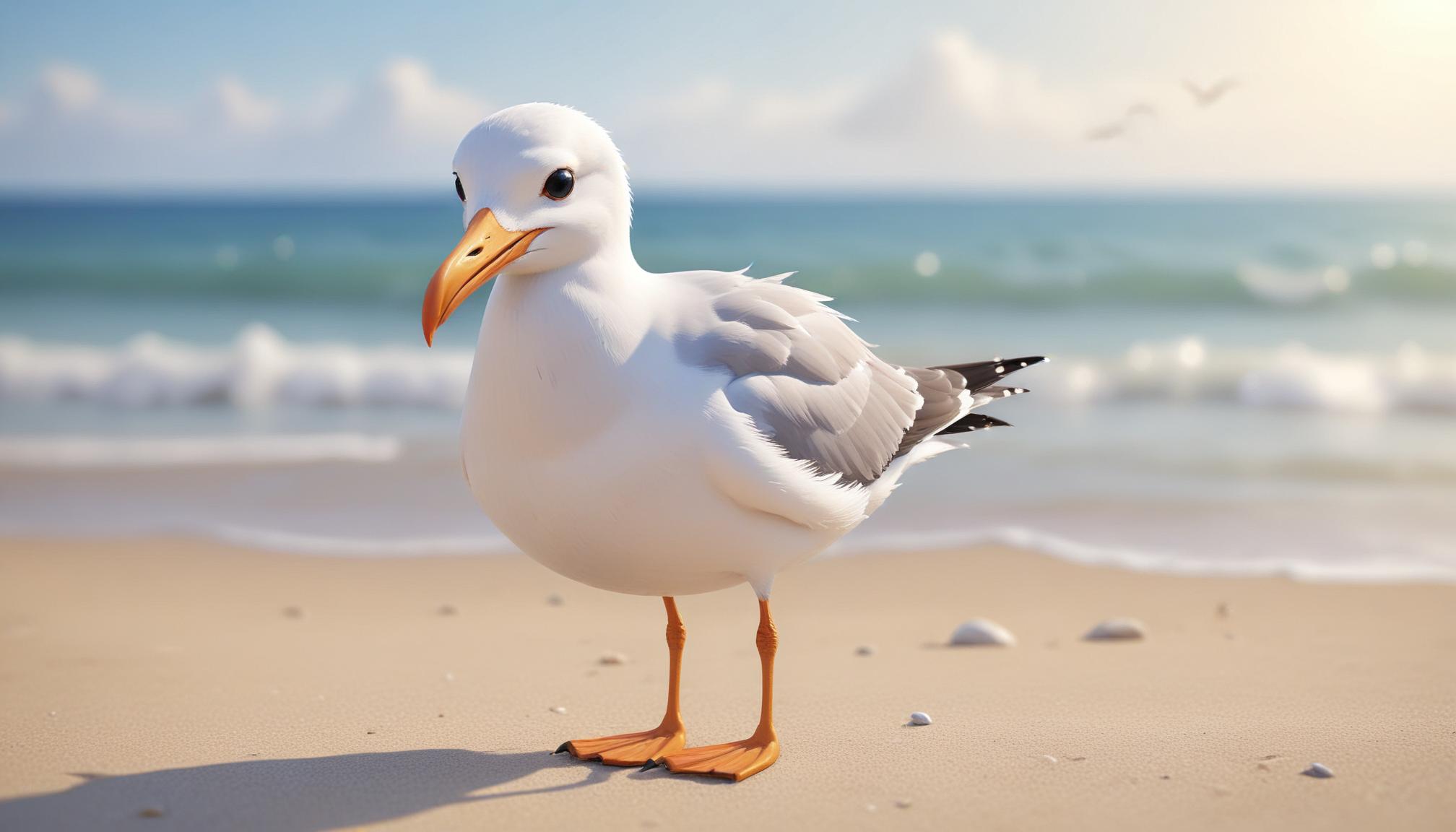 A white seagull with an orange beak stands on a sandy beach. The seagull is looking to the left, towards the ocean waves.