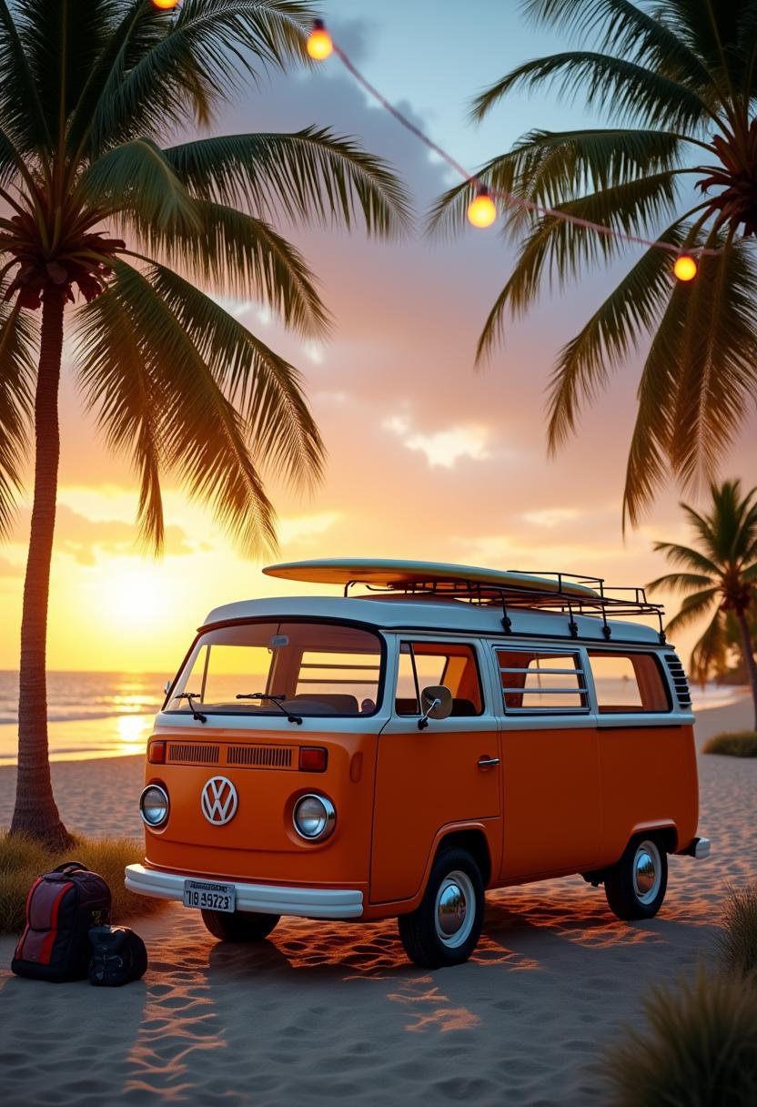 An orange vintage van with a surfboard on top is parked on a sandy beach with palm trees in the background.