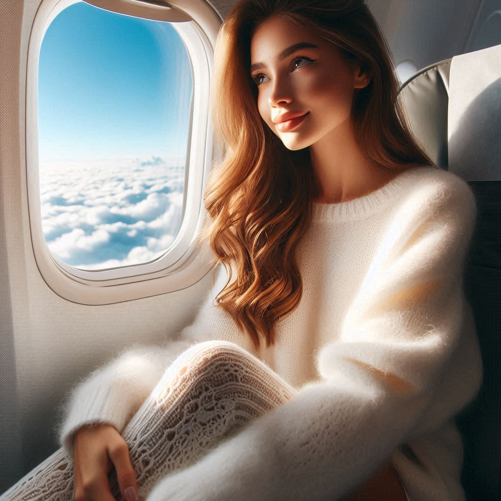 A young woman with long, wavy red hair sits by the window of an airplane. She is wearing a white sweater and white pants.