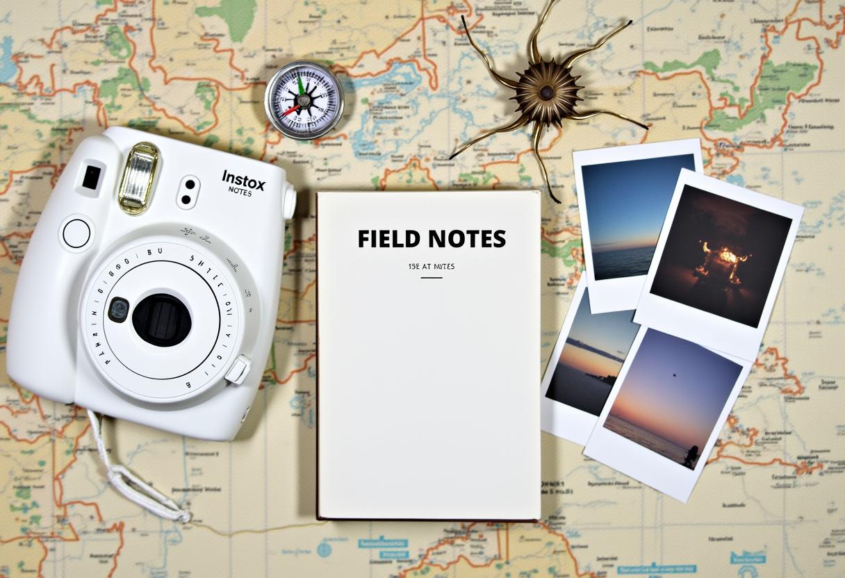 A white instant camera and a notebook labeled Field Notes are placed on top of a map with a compass and some instant photos.
