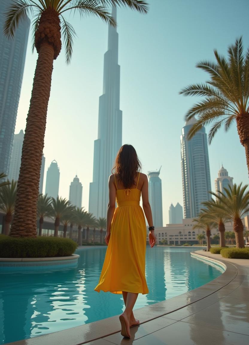 A woman in a yellow dress walks barefoot by the edge of a pool in Dubai. Palm trees line the pool, and the Burj Khalifa stands tall in the background.