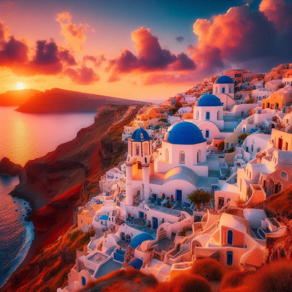 architecture, blue, buildings, church, cliff, domes, greece, landscape, mediterranean, ocean, oia, santorini, sea, sunset, tourism, town, travel, vacation, village, white