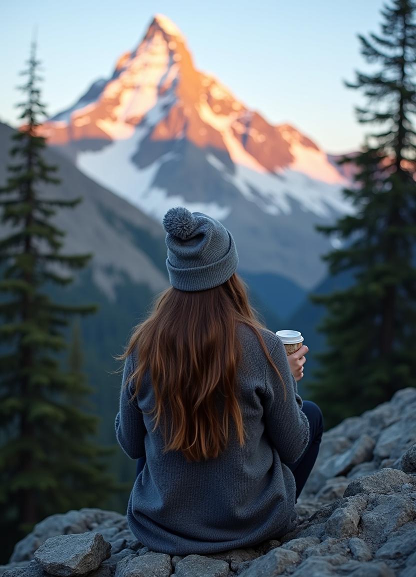 A woman with long brown hair, wearing a grey beanie and sweater, sits on a rocky outcrop, holding a cup of coffee.