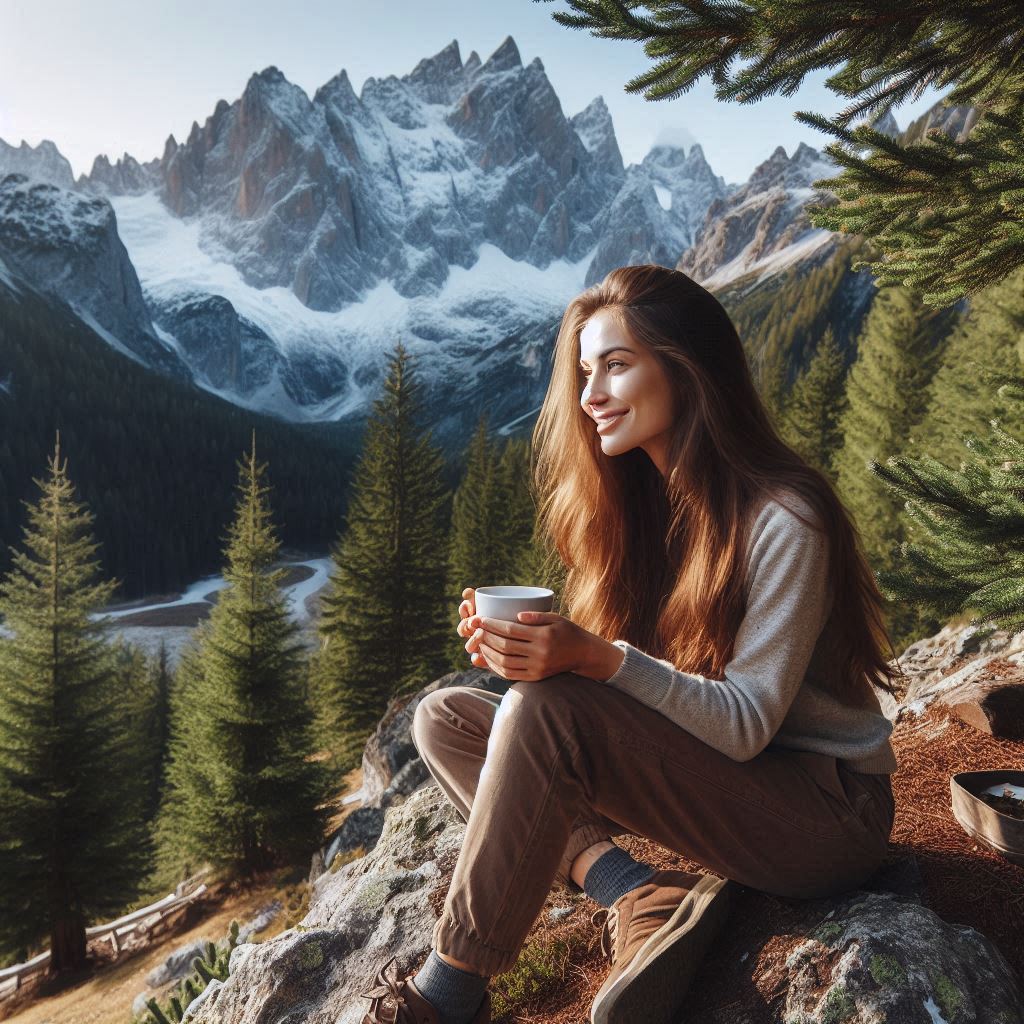 A woman sits on a rock with a cup of coffee in her hand, smiling as she looks out at a view of snow-capped mountains and green pines.