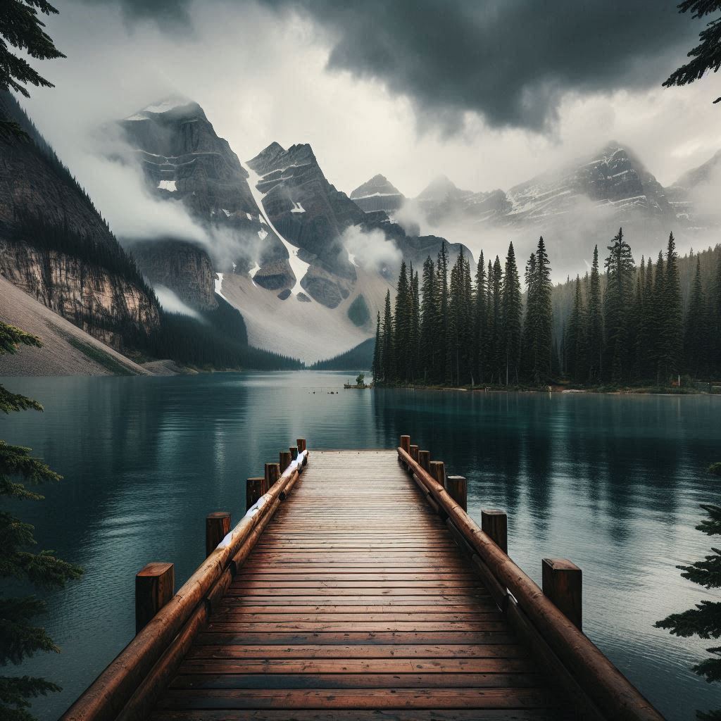 Wooden dock by a still lake near mountains