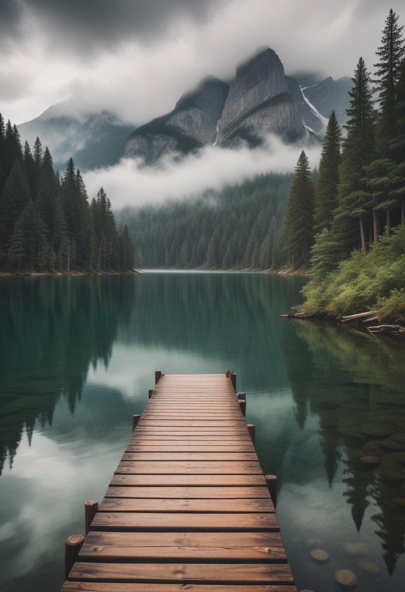 A wooden dock extends into a still lake. The water is a deep green and reflects the surrounding misty mountains and tall evergreen trees.