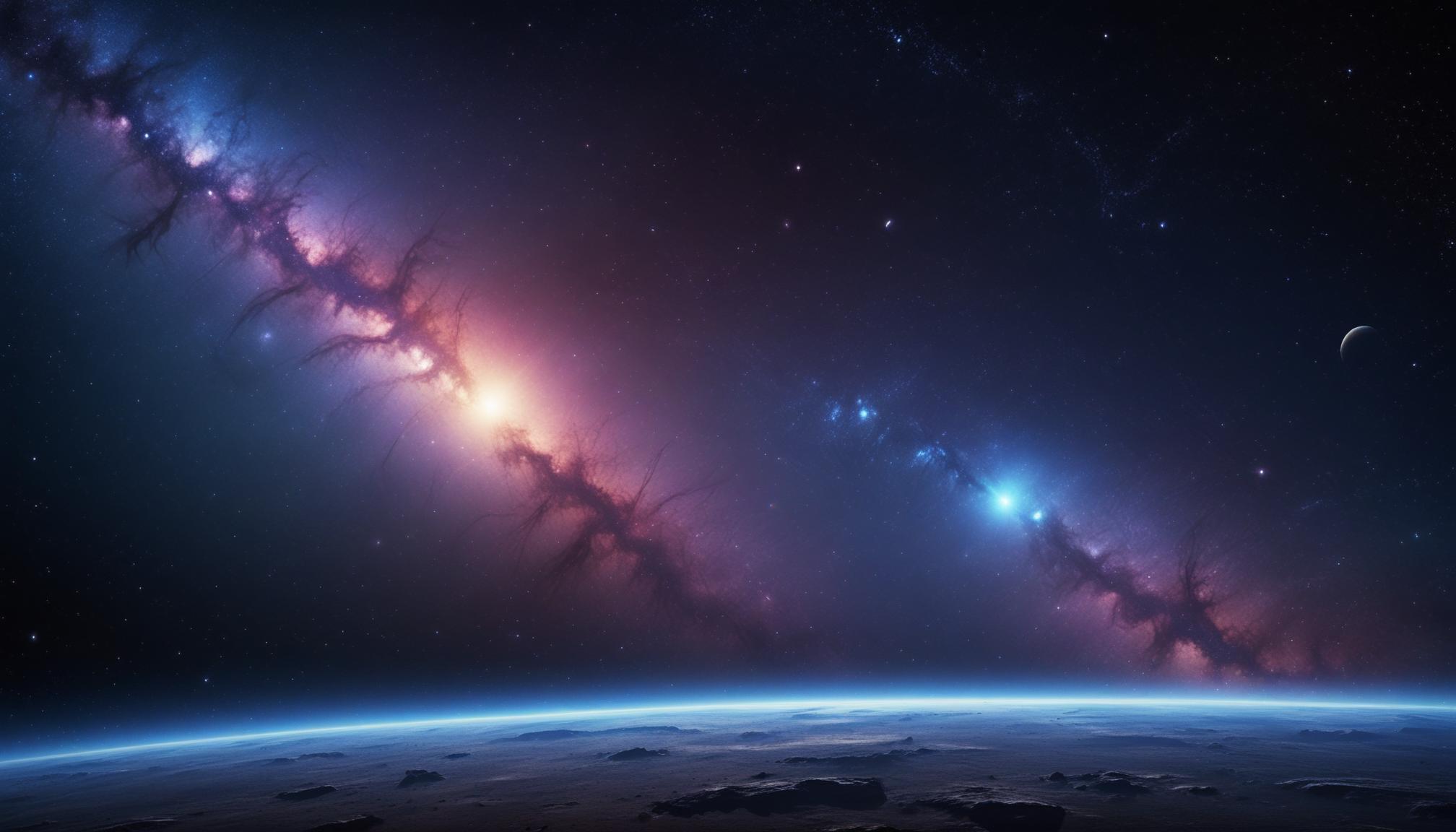 A view from a planet's surface looking up at a bright, swirling galaxy in the night sky. There is a crescent moon visible in the upper right corner.