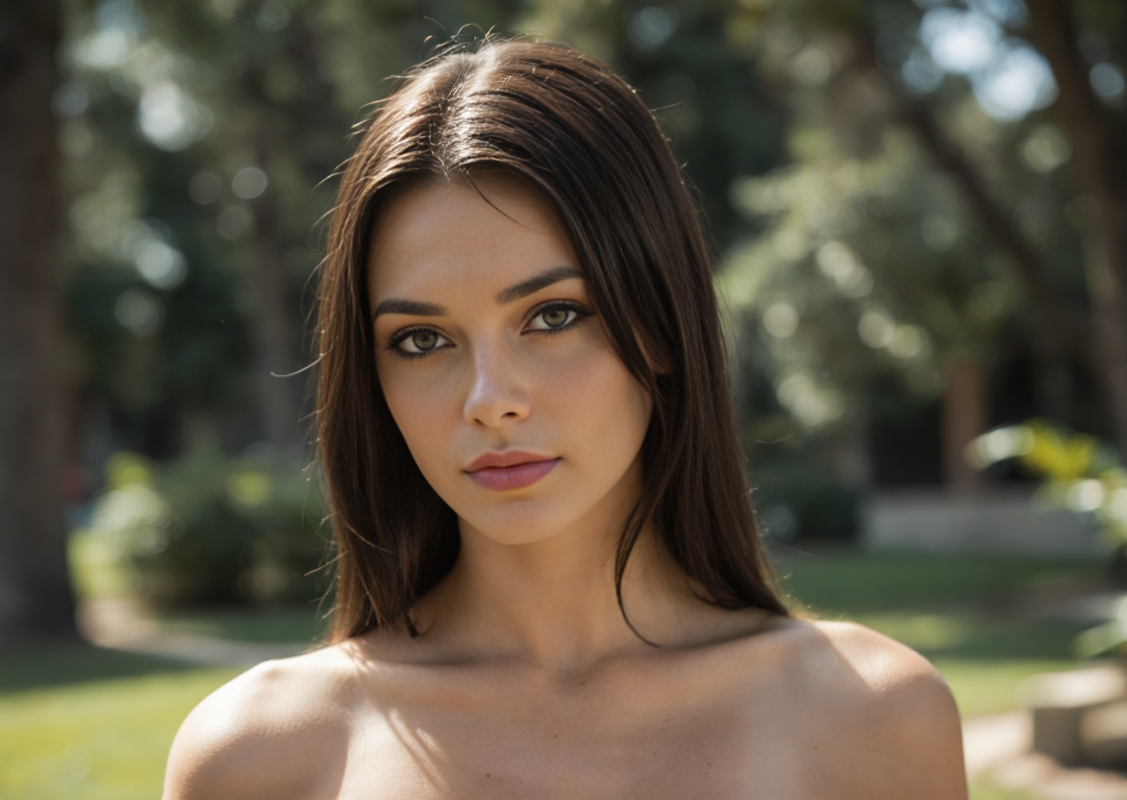 background, camera, dark hair, eyes, face, female, green, hair, long hair, looking, nature, outdoors, park, portrait, shoulder, skin, strapless, top, trees, woman
