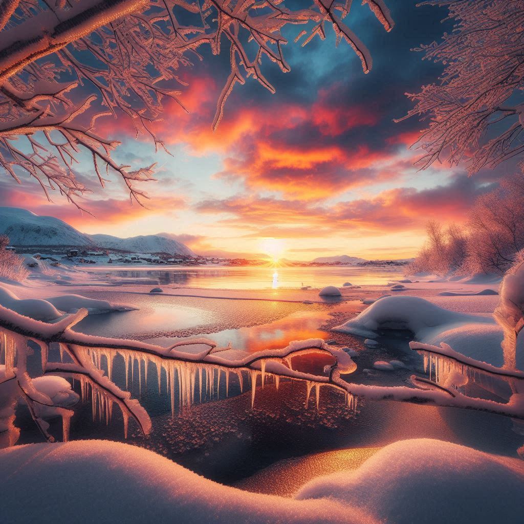 A snow-covered landscape with icicles hanging from a branch. The sun sets behind the snow-capped mountains and reflects on the frozen lake.