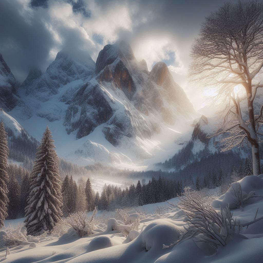 alpine, blue, clouds, cold, forest, landscape, mountain range, mountains, mountainscape, nature, peak, scenery, scenic, scenic view, sky, snow, trees, valley, white, winter