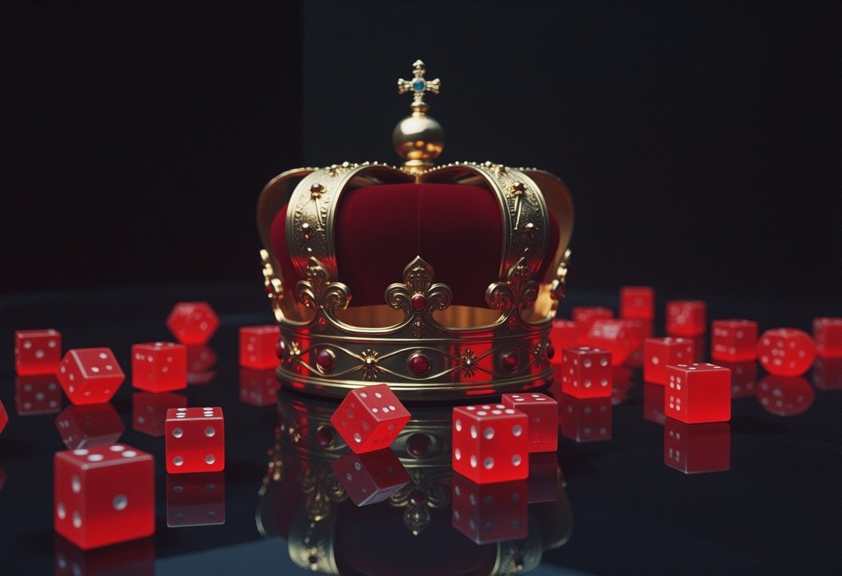 A golden crown with red velvet lining and a cross on top sits on a dark surface surrounded by red dice. The dice are scattered in front of the crown.