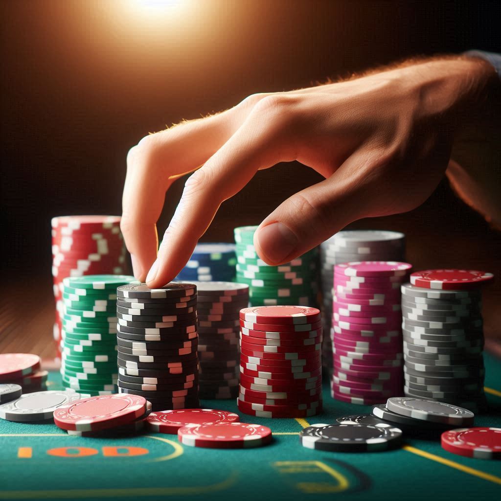 A hand reaches for a stack of poker chips