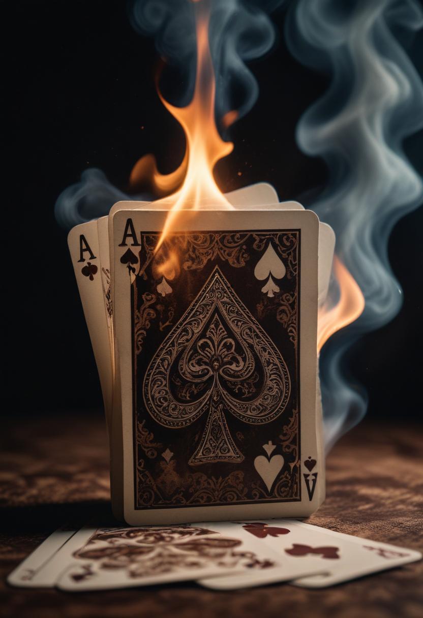 A playing card with an ornate design featuring an Ace of Spades is set ablaze, with flames rising from its top edge and smoke billowing upwards.
