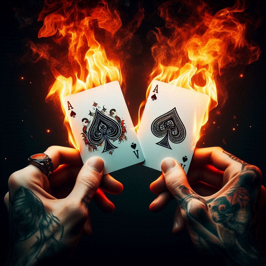 A pair of hands, one with a ring, are holding two aces of spades, both cards are engulfed in flames.