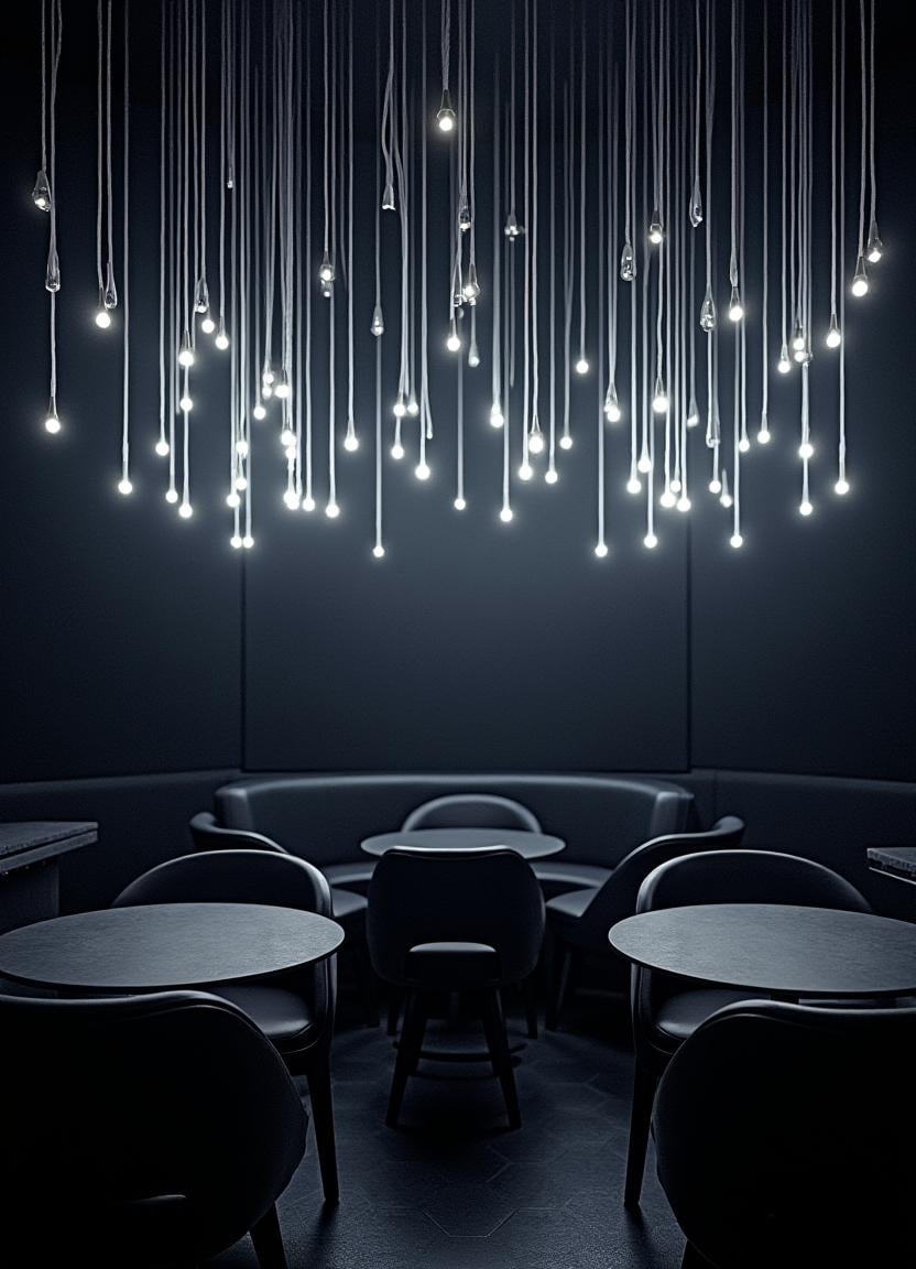 ambiance, black, bulbs, cafe, chair, contemporary, dark, design, dining, empty, interior, lighting, lights, minimalist, modern, restaurant, room, seating, space, table