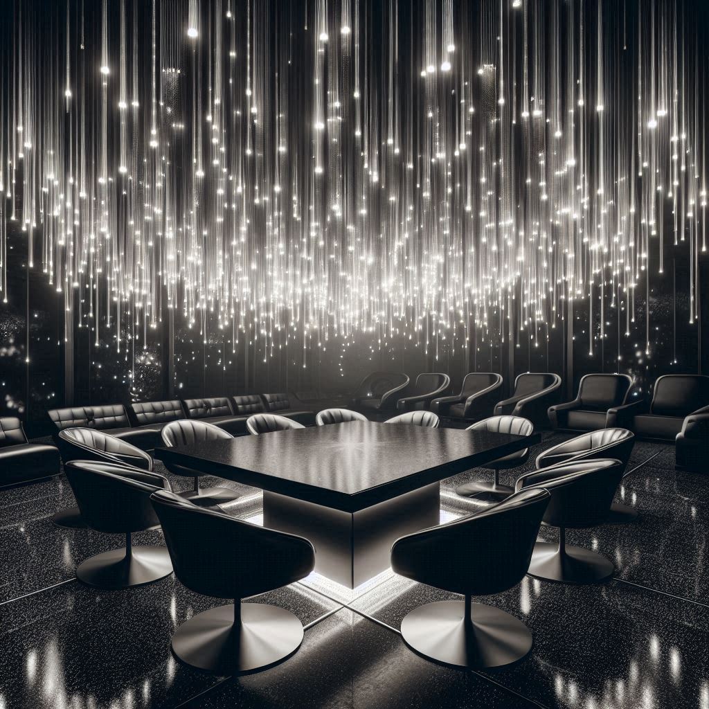 A square dining table with black leather chairs is illuminated by a dazzling array of string lights for a futuristic vibe.