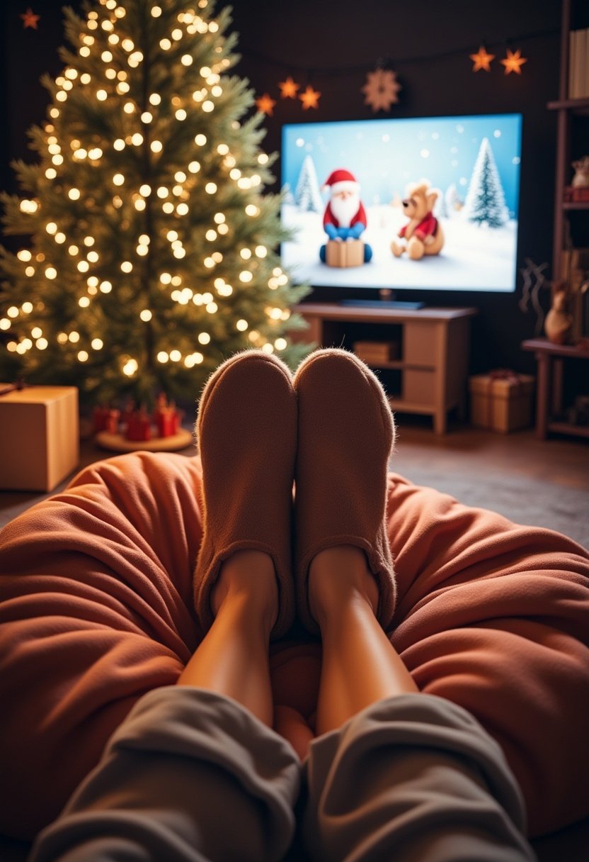 beanbag, chair, christmas, comfortable, cozy, december, family, festive, fire, fireplace, holiday, home, lights, movie, relaxing, slippers, tree, warm, watching, winter