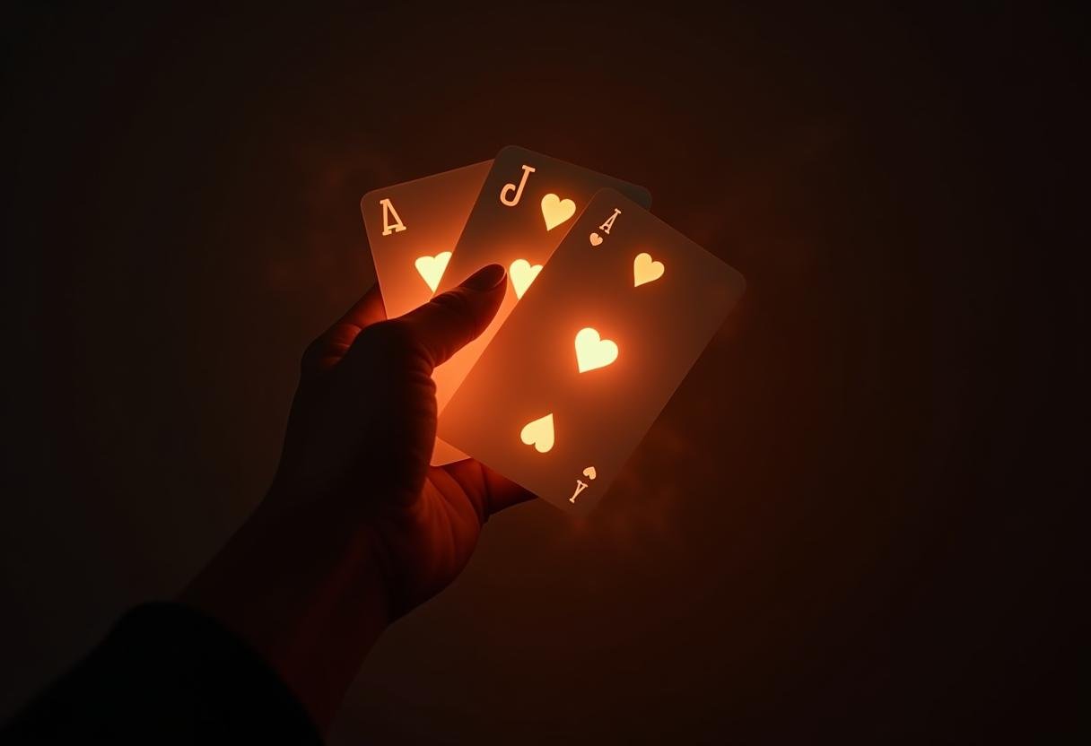 A hand holds three cards in the dark