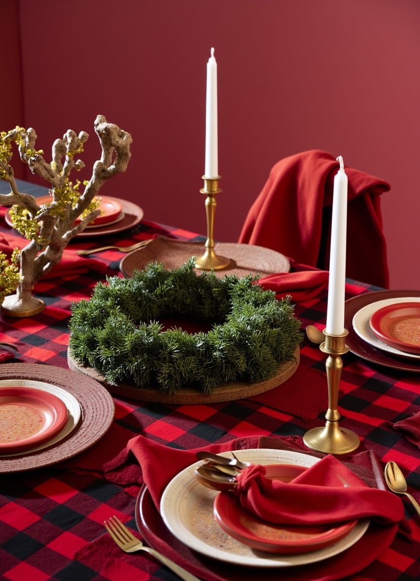 black, candle, candlestick, checkered, christmas, decoration, dinner, festive, green, holiday, meal, napkins, plates, red, setting, silverware, table, tablecloth, white, wreath