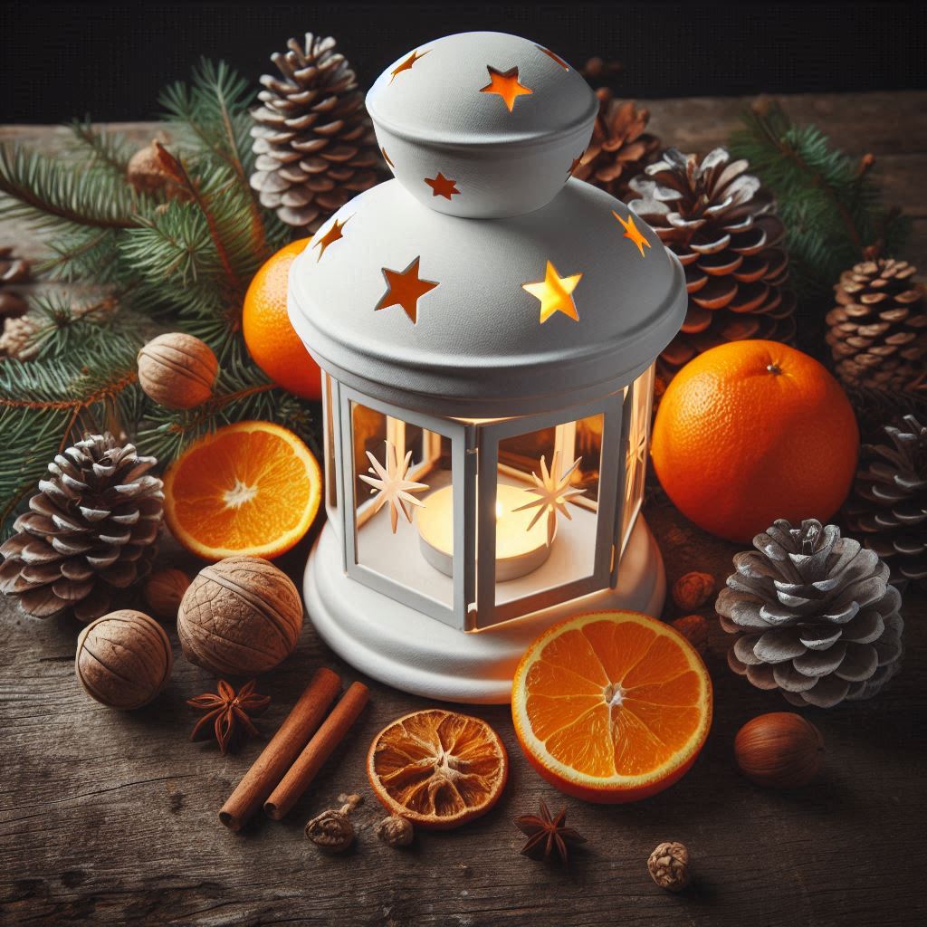 A white lantern with star cutouts and a candle sits on wood, surrounded by pinecones, oranges, cinnamon sticks, and holiday decor.
