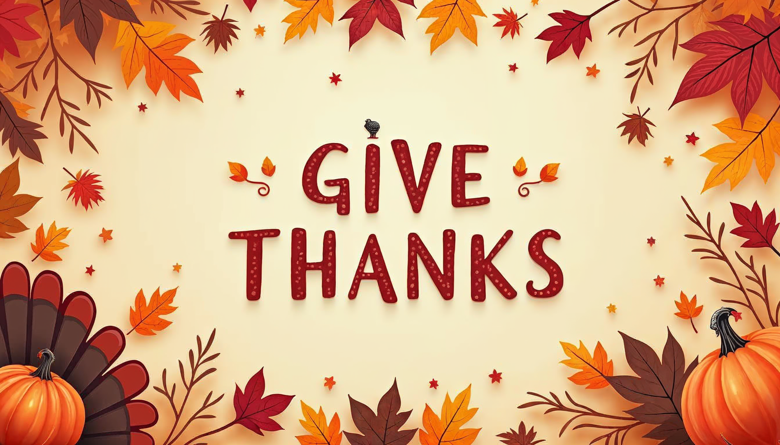 A graphic illustration of the words Give Thanks surrounded by colorful autumn leaves.