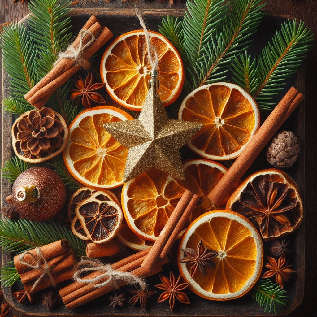Dried orange slices, cinnamon sticks, pine sprigs, and star anise are arranged on a dark wooden surface, creating a warm and inviting holiday scene.